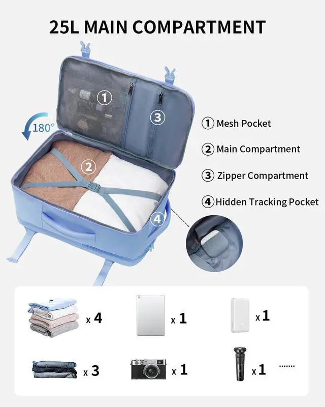 DESIGNED FOR TRAVEL: This carry on backpack features a 180° opening for easy packing. The main compartment includes two pockets to keep toiletries and socks organized, with elastic straps to secure your essentials. A dedicated AirTag pocket helps you track your bag easily. Side compression straps compact the bag, while the side handle and trolley sleeve provide multiple carrying options for added convenience.