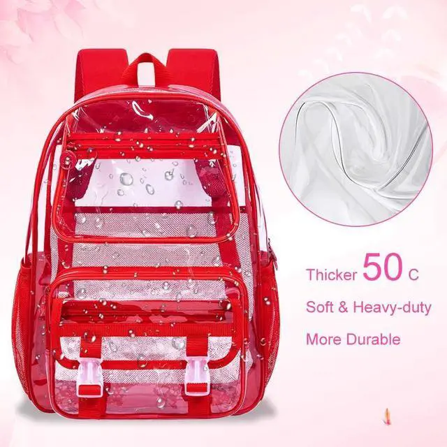Durable Transparent Backpack: Thick 50C PVC, resistant to repeated folding, not stiff in winter. The bottom polyester lining and reinforced strap link points increase the red clear bag's strength.