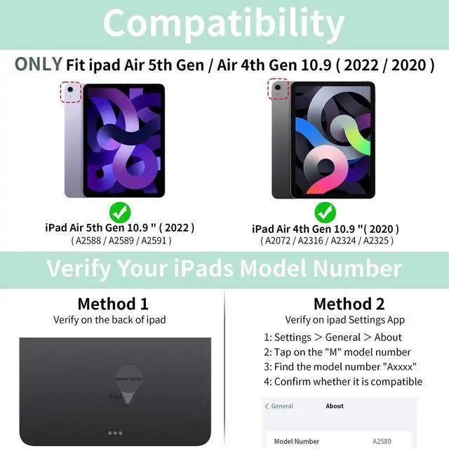 Compatibility ModelThis iPad case with keyboard is designed for iPad Air 11 Inch M3/M2 (2025/2024), iPad Air 5/4th Gen (2022/2020) 10.9 Inch ( Model: A2589/A2591/A2588/A2324/A2072/A2316/A2325/A2902/A2903/A2904). NOT compatible with any other iPad models. Please check the back bottom of your iPad to find the model number before placing order.