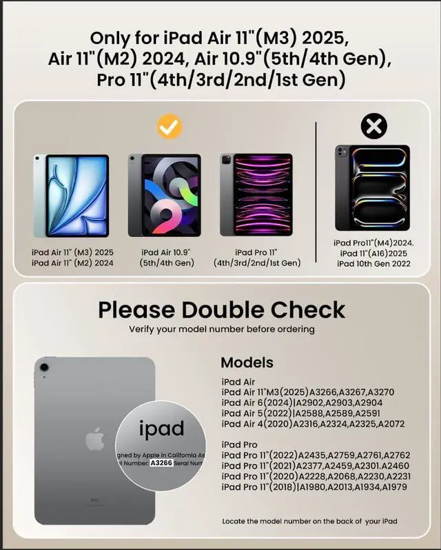 CompatibilityThis keyboard case is designed only for iPad Air 11-inch (M3, 2025): A3266, A3267, A3270; iPad Air 11-inch (M2, 2024): A2902, A2903, A2904; iPad Air 10.9-inch (5th Gen, 2022): A2588, A2589, A2591; iPad Air 10.9-inch (4th Gen, 2020): A2072, A2316, A2324, A2325; iPad Pro 11-inch (4th Gen, 2022): A2435, A2759, A2761, A2762; iPad Pro 11-inch (3rd Gen, 2021): A2377, A2301, A2459, A2460; iPad Pro 11-inch (2nd Gen, 2020): A2228, A2068, A2230, A2231; iPad Pro 11-inch (1st Gen, 2018): A1980, A2013, A1934, A1979. Please double-check the model number located on the back of your iPad to verify compatibility