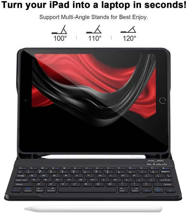 Powerful Battery &Built-in Pencil HolderBuilt-in Strong battery with energy-saving mode,it only takes 2-3 hours to fully charge,work at least 80 hours and stand by for 30+ days.The inner layer of the case is padded with a honeycomb grid,which releases 80% more heat than other iPad cases,preventing overheating to prolong the life of your iPad 6/5th Gen,iPad Air 2/1,iPad Pro 9.7'' Tablet.Built-in Apple Pencil holder,cap and adapter slot,grab your Apple Pencil for easy portability and use.