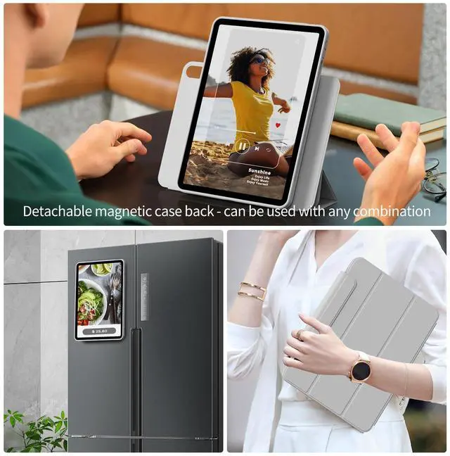 360° Adjustable Angles: The inner shell is lightweight and has built-in magnets, which can magnetically attach the iPad to the outer shell or any iron metal surface, such as a refrigerator. The outer shell adopts a tri-fold design stand and supports 9 different folding methods, allowing you to easily store it and get different viewing angles