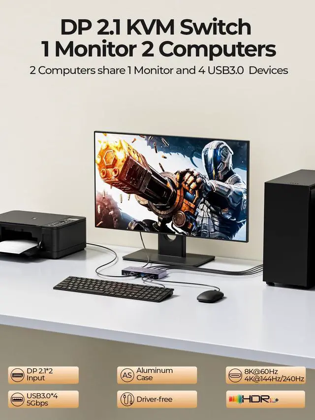 8K@60Hz HD OutputThis display port kvm switch supports up to 8K@60Hz 4K@240Hz, allowing you to enjoy realistic and colorful visual effects. Note: To achieve 8K output, you need to connect the cable supporting up to 8K output. And make sure the resolution of the input and output are the same.