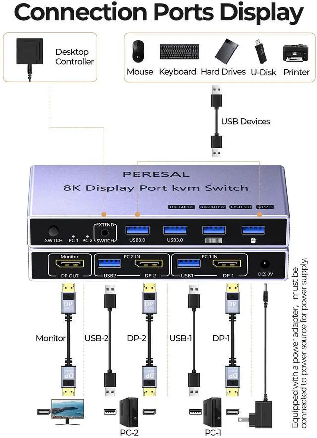 5Gbps Transfer SpeedThis Displayport USB switcher for 2 computers has 4 USB 3.0 ports to share mouse, keyboard, USB flash drive, printer, etc. The