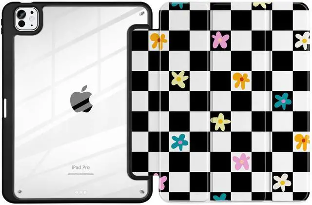 Loyrina Case for iPad Pro 13 inch (M5) 2025 (M4) 2024 Release Slim Lightweight Cute Black Leather Cover with Clear Back TPU Edge Pencil Holder Trifold Stand, Grid