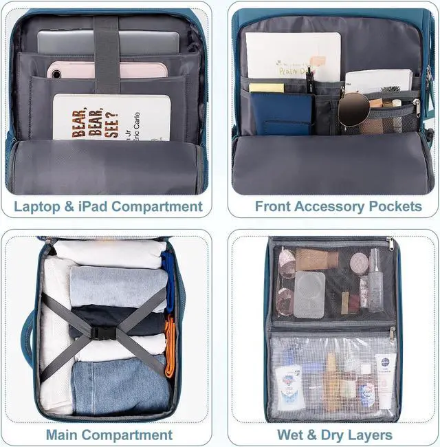 Roomy Capacity & Multi-Pockets Design: Our backpack features a spacious capacity with a reasonable partition, including a padded notebook/tablet compartment for 16" laptop and 12.9'' iPad, a wet layer design in main compartment for storing toiletries and wet items, and multifunctional storage bags outside to store sunglasses, tissue, keys, wallet, magazines, books, notes, pens, snacks etc,.