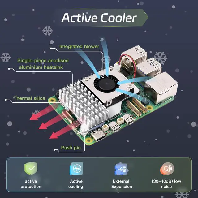 iRasptek Active CoolerThe active cooler is made of high-quality anodized aluminum with a high-performance PWM fan, which is able to effectively reduce the temperature of Raspberry Pi5 and ensure that it maintains good performance during long periods of high load operation.