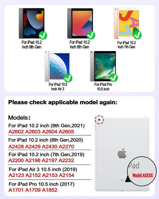 Compatible DevicesThis keyboard case is only compatible with iPad 9th Generation 10.2 inch (A2602,A2603,A2604,A2605).iPad 8th Generation 10.2 inch (A2428,A2429,A2430 ,A2270).iPad 7th Generation 10.2 inch (A2200,A2198, A2197,A2232).iPad Pro 10.5 (A1701,A1709).iPad Air 3rd 10.5 (A2123,A2152,A2153,A2154).Not suitable for other iPad devices.Please check the model number starting with ""AXXXX"" on the back of your iPad before purchasing (Note: Pencil and iPad are not included in this Product)