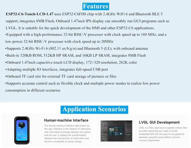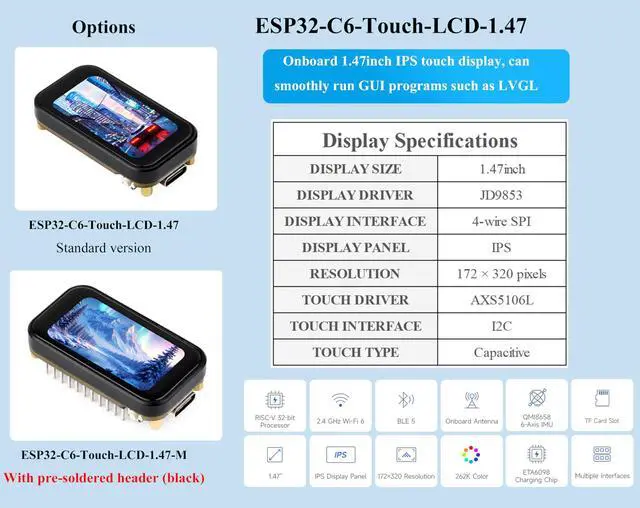 1.47inch Touch Display: Onboard 1.47inch IPS Capacitive Touch LCD display, 172x320 resolution, 262K color. Integrated AXS5106L capacitive touch chip, supports high-sensitivity touch operation, fast response speed and long life.