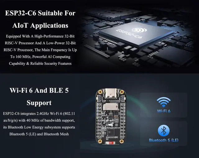 ESP32-C6FH8 Processor: Equipped with a high-performance 32-bit RISC-V processor with clock speed up to 160 MHz, and a low-power 32-bit RISC-V processor with clock speed up to 20MHz. Powerful AI Computing Capability & Reliable security features. It is suitable for the quick development of the HMI and other ESP32-C6 applications.