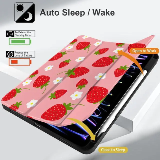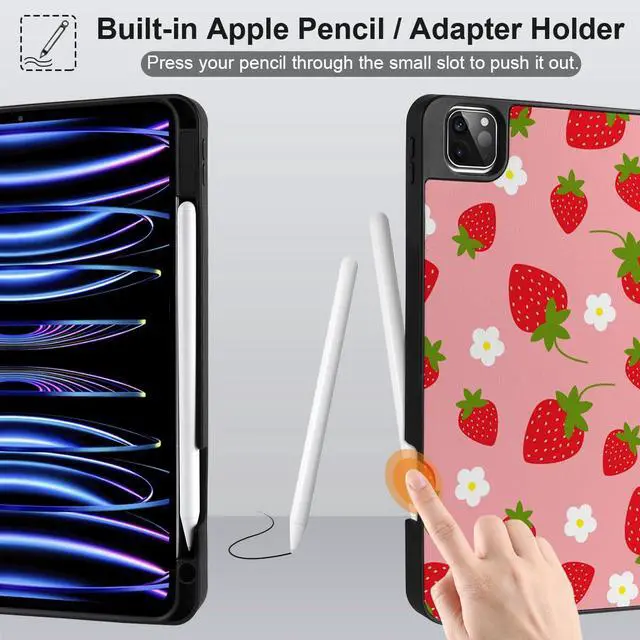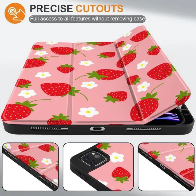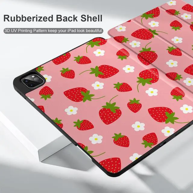 MEEgoodo Case for iPad Pro 12.9 Case M2 6th/5th/4th/3rd Generation 2022 2021 2020 2018, Protective Tablet Cover with Soft Back Shell for Kids, Strawberries & Flowers
