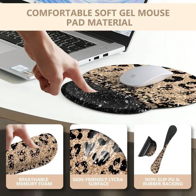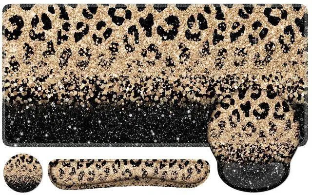 iLeadon Mouse Pad Set, Desk Mat + Mouse Pad with Wrist Rest + Keyboard Wrist Rest + Coaster, 4in1 Leopard Mouse and Keyboard Pad Set for Home Office, Black Gold Leopard