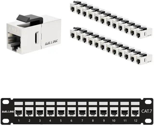 1. Iwillink UL-Listed CAT7 RJ45 Keystone Jack Inline Shielded Coupler (25 Pack), Ethernet Cable Extender Adapter Female to Female for Cat7/Cat6a/Cat6/Cat5e/Cat5 Network Cable 2. iwillink 12 Port RJ45 Through Coupler Cat7 Patch Panel STP Shielded with Back Bar, Wallmount or Rackmount, Compatible with Cat5, Cat5e, Cat6, Cat6A, Cat7 Cabling