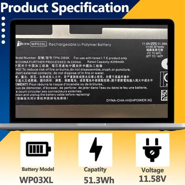 SpecificationsModel: WP03XL Capatity: 51.3Wh/4249mAh Voltage:11.58V Battery type: Rechargeable Li-ion Battery Color: Black 100% brand New from Manufacturer.