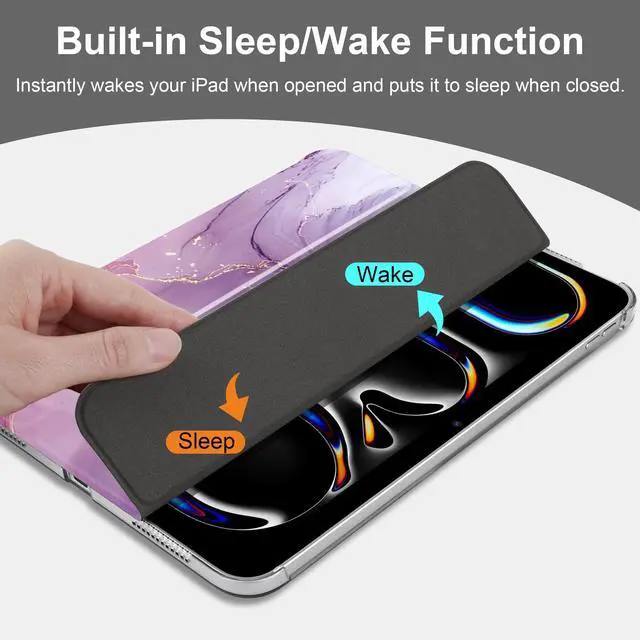 Magnetic protective cover automatically wakes iPad when open and hibernates when closed to conserve power. Tri-fold stand provides the perfect viewing and typing angle