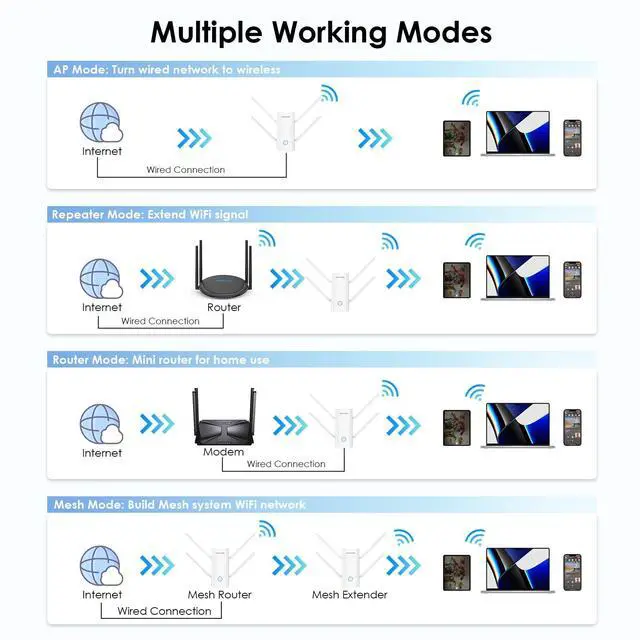 Multi-Working ModesThe WiFi wireless signal booster offers versatile modes: Repeater/AP/Router/Mesh. Repeater mode expands WiFi co