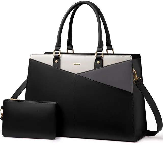 LOVEVOOK Laptop Tote Bag for Women, Leather Business Office Work Bag Computer Briefcase with Small Clutch fit for 15.6 Inch Laptop, Black-Beige-Grey