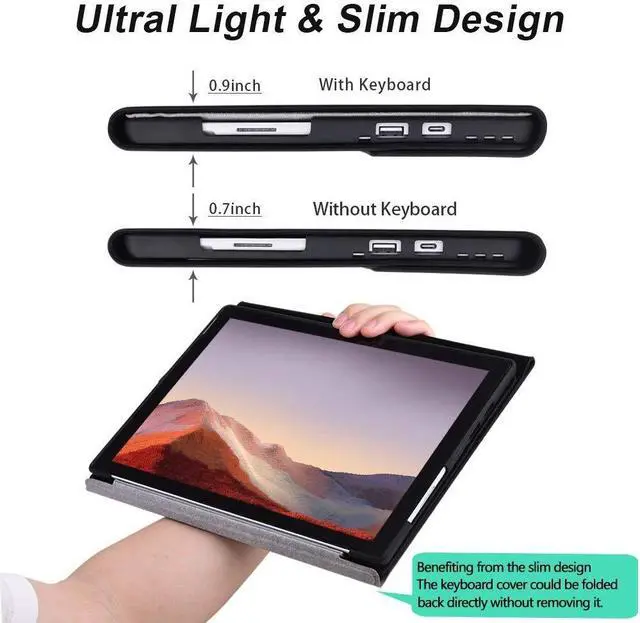 Material: TPU Waterproof Polyester Shell Cover, Compatible with Type Cover Keyboard, Slim, Lightweight, High Protective, Soft Touch, Dirt resist, non-slip, Durable.