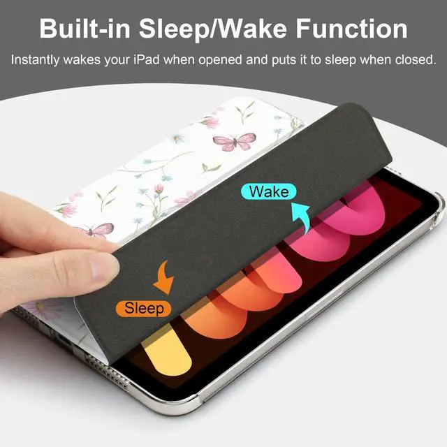 Magnetic protective cover automatically wakes iPad mini 7th/6th Gen when open and hibernates when closed to conserve power. Tri-fold stand provides the perfect viewing and typing angle