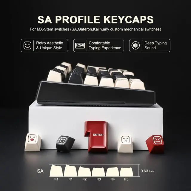 SA Profile Customised Keycaps: Unique height for greater contact surface and height, R1-R4 layouts with different heights and tilt angles. Provides a more comfortable and ergonomic typing experience with better sound