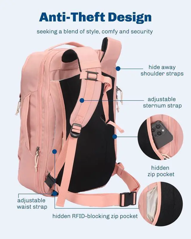 Weight: 2.79 lbs/ 1.27 kg ^^ TSA Friendly DesignThe back zip compartment fully opens at 180 degrees for a quick and hassle-free airport security check. Laptop backpack for men accommodates most 17-inch laptop and 10.5 -inch tablet, with padded protection. Womens laptop backpack features with 1 mesh pocket and 1 zip mesh pocket keep travel must haves organized. ^^ Anti-Theft DesignBackpack for travel enhanced with a lockable zipper for back device compartment and a hidden RFID-blocking pocket, this backpack is designed to keep your devices and personal information secure. Anti-Theft backpack is ideal for women and men seeking a blend of style and security. (combination luggage lock not include) ^^ Functional Compartments Protects sunglasses in the front top zip soft lining pocket, keys are secured with a chain in front vertical zip pocket, organizes 3-5 days travel essentials in the main zip compartment, from jeans to shirts, stores small travel acessories items in the 2 interior mesh zip pockets, holds a water bottle or folding unbrella on the exterior zip pocket, and keeps valuables safe in a hidden back zip pocket. ^^ Ergonomic Versatile BackpackTravel backpack carry on flight approved bag designed with dual contoured padded, hideaway shoulder straps and a breathable mesh back to enhance the carrying experience, adjustable sternum and waist straps help alleviate weight, while a luggage slip pocket offers flexibility.
