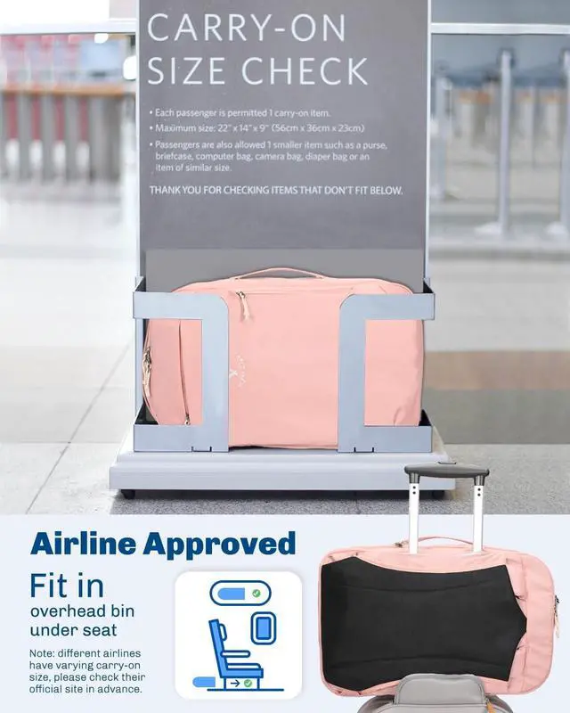 Compressible Carry OnMade of water repellent 420D nylon and 210D polyester lining, carry on backpack expands from 30L to 40L, fitting most of IATA carry on sizes and overhead compartments. Approx.