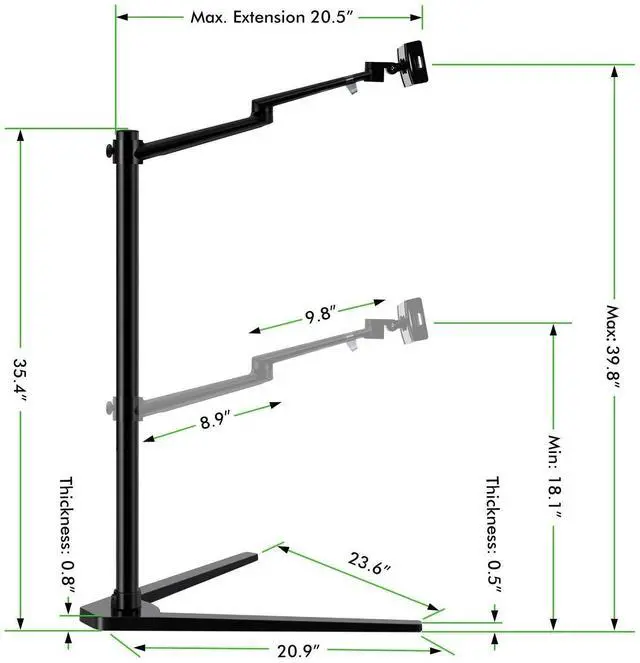 ^^ FULLY ADJUSTABLE DESIGN: With a 360-degree rotation angle which provides optimal screen visibility according to your needs, plus a fully adjustable height from 18.1 ''- 39.8 '' and an extendable bracket arm, this versatile tablet stand is ideal for all your needs, keeping your body comfortable at all times! ^^