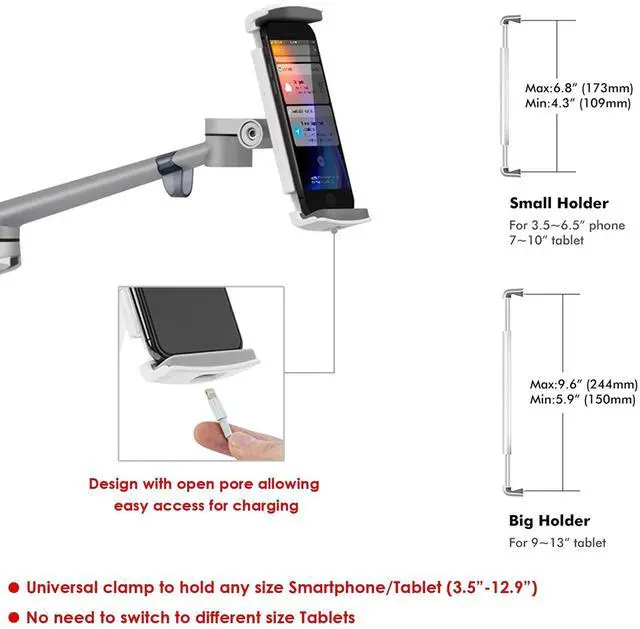 ^^ WIDELY COMPATIBLE: This adjustable tablet holder was designed to ensure full compatibility with all smartphone and tablet sizes, including the latest generation iPhone, iPad, iPad Pro 12.9, MS surface Pro, Samsung Galaxy and more, anywhere from 5 to 13 inches.