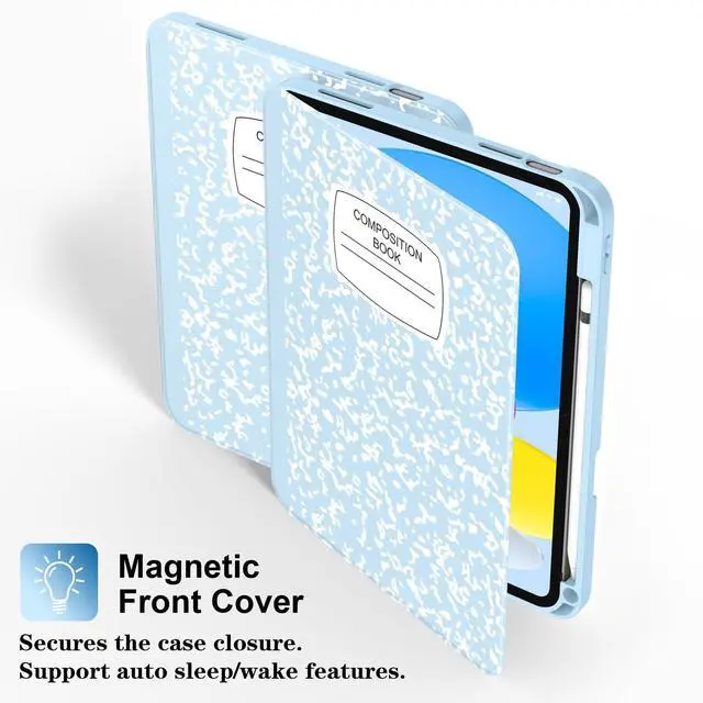 ModelsComposition notebook iPad case designed for new iPad (A16) 11th generation 11 inch/10th generation 10.9 inch released in 2025/2022. Not compatible with other iPad models(ipad 10.2 9th/8th/7th Gen) ^^ MaterialMade of flexible silicone back & TPU cover, iPad (A16) 2025/2022 case provides full protection against shocking & scratching for your new iPad 11th/10th generation 2025/2022 ^^ Multi anglesAnti-slip front stand shell (Not trifold) creates different angles for viewing or typing; magnet secures the iPad 11th/10th generation case closure, easy to snap on and off ^^ FunctionBuilt-in pencil holder makes iPad 11th/10th generation 2025/2022 case convenient to carry and better protect your Pencil.