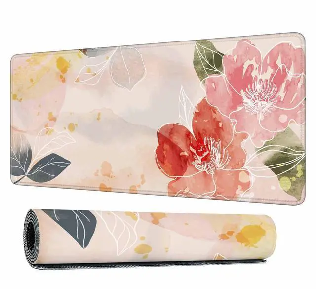 Y YIHANGBEST Floral Watercolor Art Mouse Pad Desk Mat Pink Flower and Green Leaf Large Gaming Mousepad for Keyboard PC.Home,Office 35.4"X15.7"