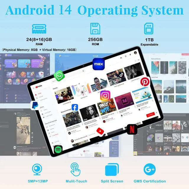 • Compatible with Widevine L1You can watch Prime Video, Disney+, Hulu, and more in high quality with brilliant Watching Experience. The GMS Certified latest Android 15 Tablet, with basic Google apps already on and without bloatware. Get rid of unexpected ads and download apps from Google Play, such as SKYGO, YouTube and more.