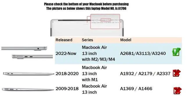 Models: A3240 (M4 2025) /A3113 (M3 2024) /A2681 (M2 2022). Verify "A1xxx" on device underside before purchase. ^^ NOT compatible with MacBook Air 13.3 Inch M1 Model A2337/A1932/A2179(2018-2020 Ver. ) nor Macbook Air 13 inch( 13.3 ) Model A1369/A1466 Old Version 2010-2017. ^^ High Quality Hard Shell Case for original touch protect your MacBook, strong and durable material against shock, scratch, fingerprint, dusty and other damage, thin and light design will not increase excess volume. ^^ Easy to put on and take off and Plug your charger, cable or headset without removing the protective case. Air-follow through ventilation areas for heat release, Rubberized feet to keep your MacBook firmly in place ^^ 2 in 1