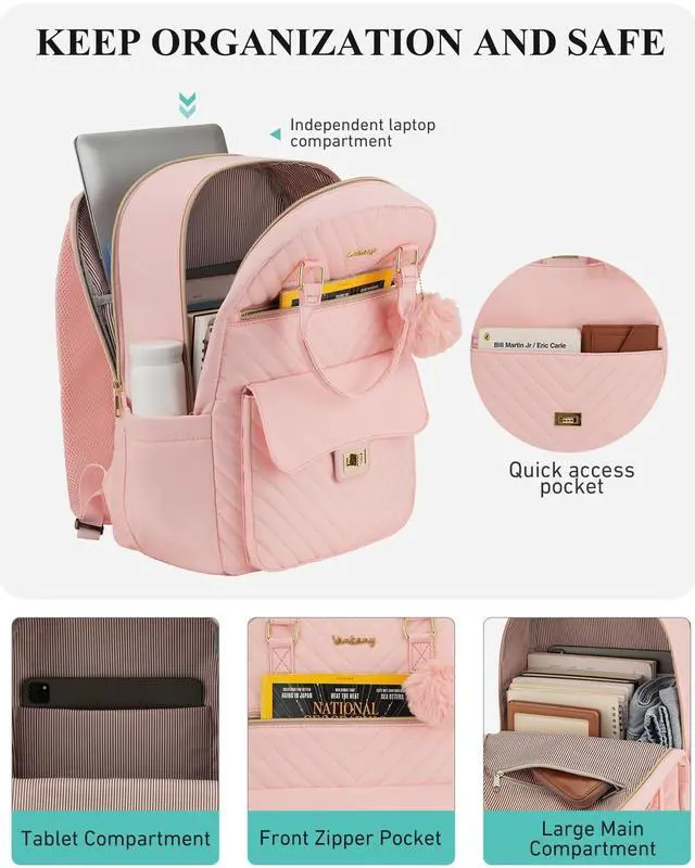 Large Capacity: Featuring a separate padded laptop compartment that holds and protects a 16 / 17 inch laptop, ensuring your tech stays safe on the go. The large main compartment is roomy for daily necessities, such as folders, text books, lunch box, clothes and electronic. Quick access front pockets are perfect for keeping all of your smaller items secure. On the outside, it has two water bottle pockets and a back anti-theft pocket for secure storage ^^