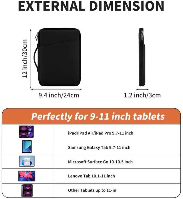 Dimensions: 12* 9.4 * 1.2 inch. This sleeve is designed to fit most 9-11 inch tablets and iPads, including New iPad Air 11 M2, New iPad Pro 11" M4, M2, M1, New iPad 10.9 A14, Samsung Galaxy Tab S9/S8, and Surface Go 3/2/1 ^^