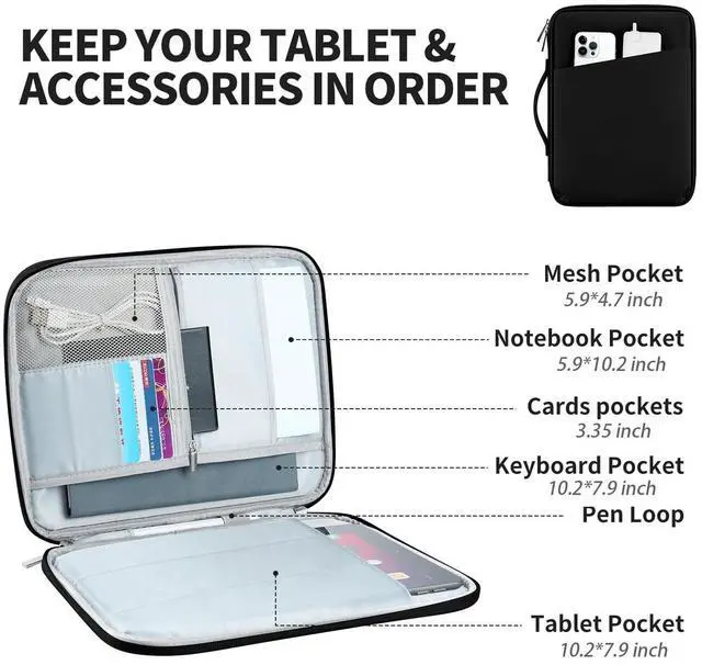 Capacity & Organized: With ample space, this iPad carrying case not only holds your device securely but also offers organized storage for your chargers, cords, earbuds, battery packs, notebook, pens, and more ^^ Convenient and