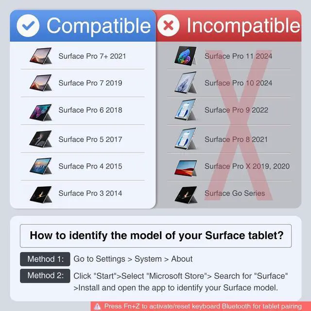 Compatibility: Before making a purchase, please check your model number in [Settings > System > About] and refer to the compatibility chart. Compatible only with Microsoft Surface Pro 7+, Surface Pro 7, Surface Pro 6, Surface Pro 5, Surface Pro 4, Surface Pro