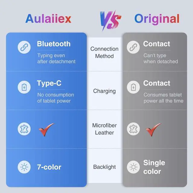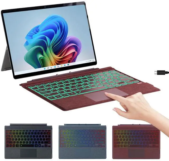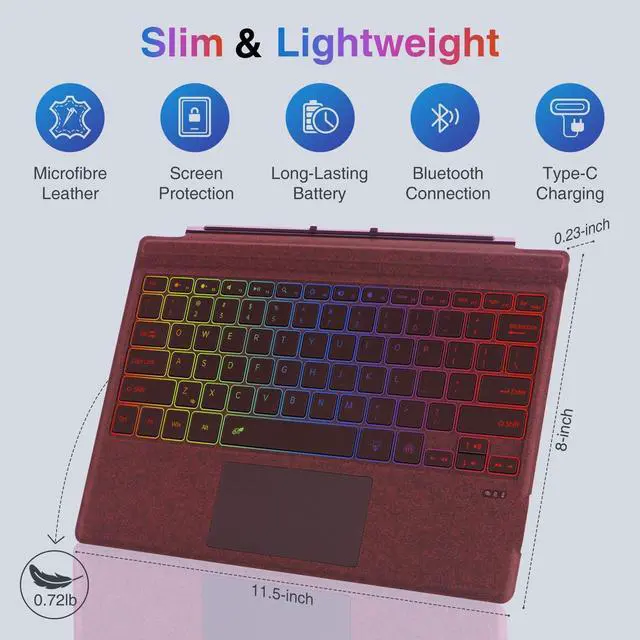 Typc-C Charging: Connect your Surface Pro tablet via wireless Bluetooth, it can be typed normally even after detached. It can be fully charged in about 2h by Type-C charging cable, support charging and using at the same time, without consuming your tablet power. ^^ Slim & Lightweight & Microfiber Leather: Using microfiber fabric similar to the original keyboard, it is thin, lightweight, scratch-resistant, wear-resistant, does not leave fingerprints, feels comfortable, and protects the screen. The keyboard weighs only 0.72 pounds, making it easy to carry without any burden. ^^ 7-Color Backlight and Long Lasting