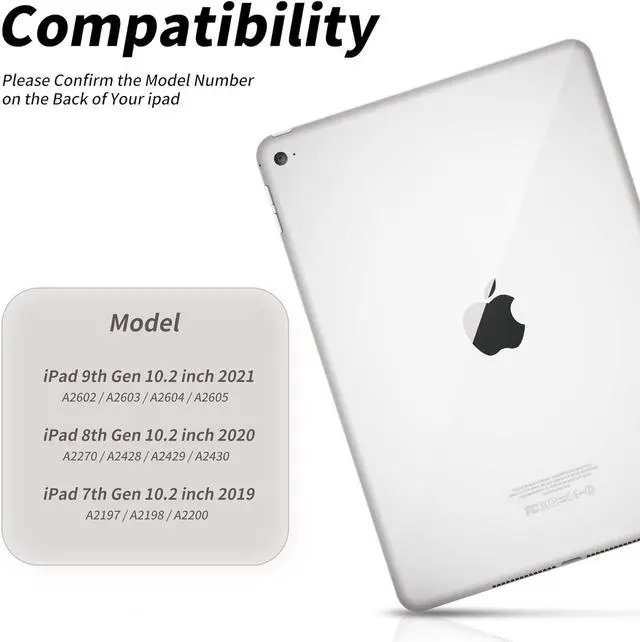 • Compatibility ModelThis iPad Keyboard Case is designed for iPad 9th / 8th / 7th Generation 2021 / 2020 / 2019 10.2 inch. ( Model: A2602 / A2603 / A2604 / A2605 / A2270 / A2428 / A2429 / A2430 / A2197 / A2200 / A2198 ). NOT compatible with any other iPad models. Please check the back bottom of your iPad to find the model number before placing order.