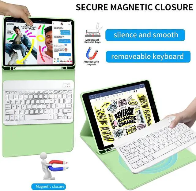 • Slim Wireless Bluetooth KeyboardThe slim (6.2mm) removable keyboard is attached to this Apple iPad 9th generation case with keyboard magnetically (supporting Windows, IOS & Android System), let your ipad instantly become a portable laptop, perfect for working, typing, editing or watching videos, greatly improved your iPad productivity.