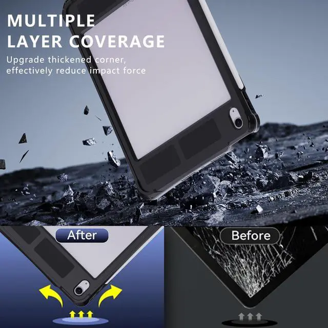 [Precise Cutout, Perfectly Fit] Compatible with iPad Air 11 inch M2/M3 (2024-2025 Released), iPad Air 5/4 10.9 inch (2020-2022 Released). Please check the correct model number on the back of the device ^^ [IP68 Waterproof] For iPad Air 11 inch 2024 case is front and back cover design, fully sealed, diving underwater 6.6 feet (2 meters) without moisture. Also dustproof, effectively prevent irritating liquid, hair, or other small particles enter your tablet ^^ [Military Grade Full Body Protection] Feature with Built -in Screen and Camera Protector, hybrid frame design, 4 Thickened shock-absorption corners, provide maximum protection for your ipad air 6th/5th/4th against the impact force ^^ [Multi-functional design] Work with ipad air 6th/5th/4th generation case with Built-in Pencil Holder design, its convenient to place your apple pen in the pencil slot for anti-loss.