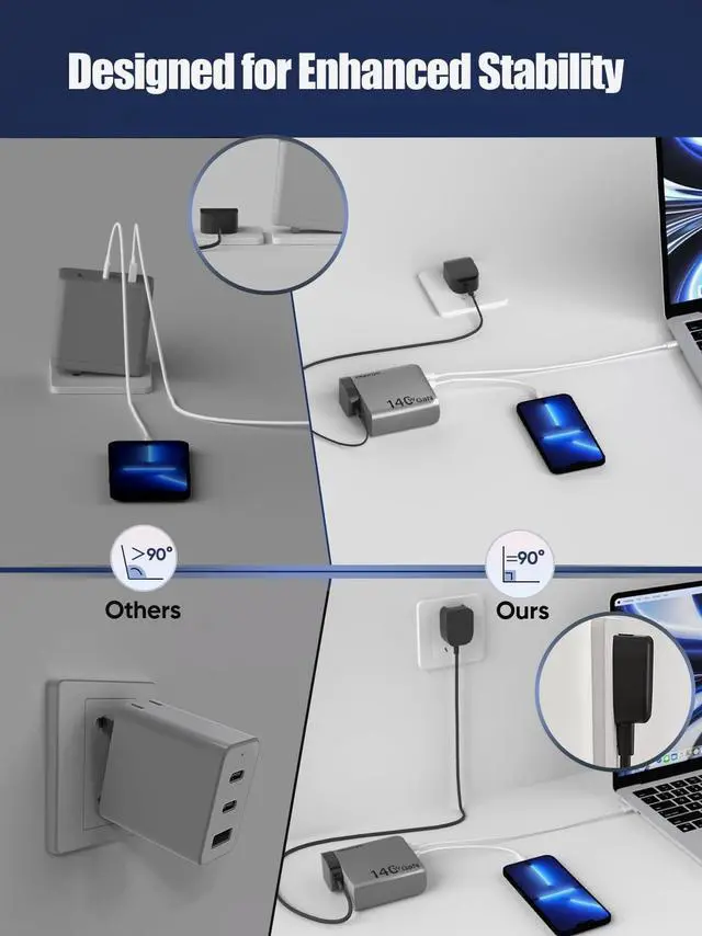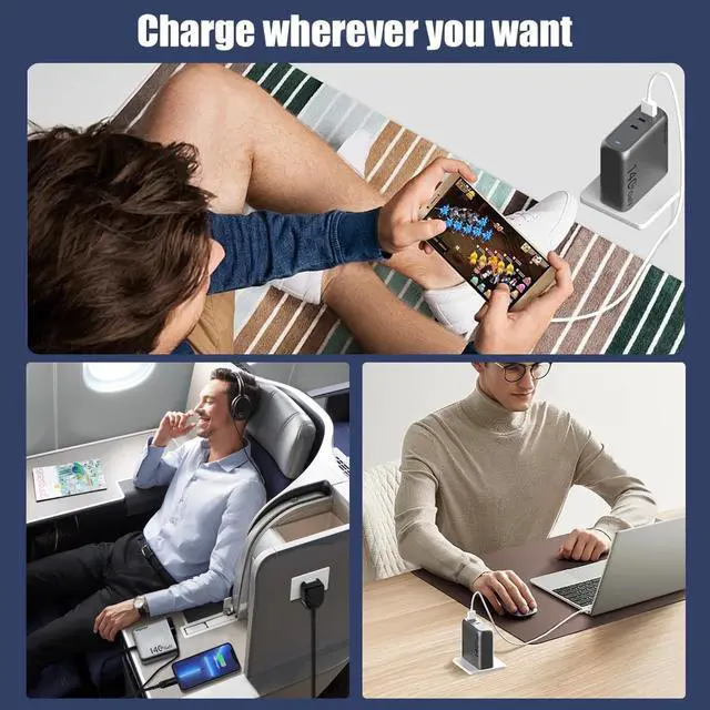 ^^ 3-in-1 Multi-Port ChargingThis 140W USB-C charger features two PD 3.1 USB-C ports and one USB-A port, allowing you to charge two 14-inch laptops and a mobile phone simultaneously. This 140W GaN charger is fast enough for users with multiple devices. Additionally, it intelligently adjusts the charging power via its built-in chip, ensuring compatibility with nearly all USB charging devices. One 140W charger is all you need to meet all your charging needs. The 140W USB-C power adapter MacBook Pro ensures that your devices are always powered up and ready to go.