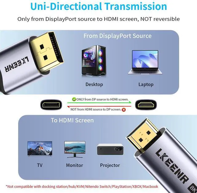 Note: Not compatible with hubs, docking stations, or KVM switchesonly supports DisplayPort source devices connected to HDMI display devices. ^^ LKEENRis dedicated to introducing superb-quality products that are sophisticatedly designed and reasonably priced for providing the best solutions to connect your work and life. Consult for fast and responsible support within 18hrs!