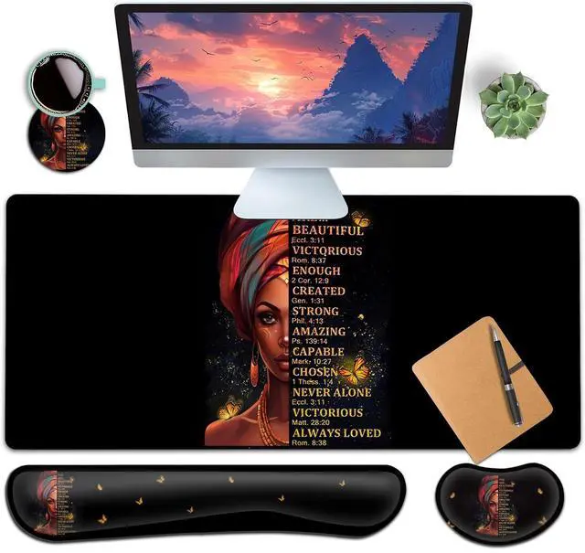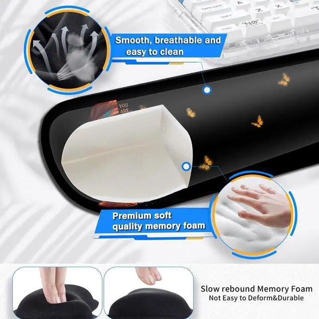 Extended Large SizeThe size of large mouse pad for desk is 31.511. 8inch, which is big enough to fit your full-sized keyboard, mouse, laptop, or other item on the desk, providing more space for professional gaming or office work. Besides, you can also use this extended mouse pad as a desk pad, writing pad, platform protection mat. Keep your desk clean and uncluttered. Ergonomic DesignThe curved and shape design of wrist support set fit perfectly on the wrist. The soft memory foamand filled cushion part will slowly bounce back when your hand leave it, not easy to out of shape.