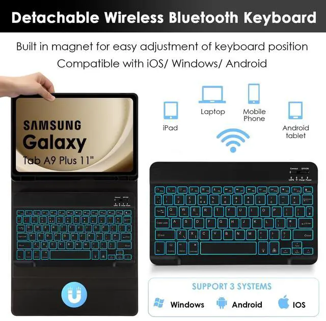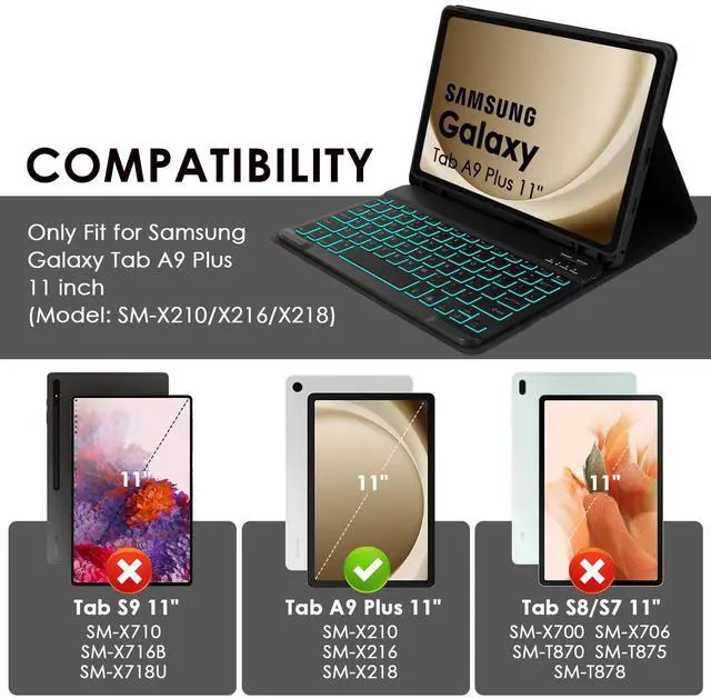 [Compatibility with Samsung Tablet A9 Plus/A11 Plus 11" ]: This keyboard case is exclusively designed for Samsung Galaxy Tab A9 Plus 11 Inch 2023 Model (SM-X210/X215/X216/X218) and Tab A11 Plus 11 Inch 2025 Model (SM-X310/X315/X236). ***Please Click your tablet "Settings-System-About Tablet Model--SM-XXXX") confirm model number before ordering. Not fit for other size or model number! ^^ Maganetically Removable Wireless KeyboardThis case with keyboard for Samsung Galaxy A9+/A9 Plus Tablet uses a flip magnet separate design; Detachable Bluetooth keyboard with magnetic hybrid case that transforms your tablet into a highly performant and easy-to-use laptop. ^^ Full Protective Case with S Pen Holder The premium composition leather exterior and soft, non-slip interior protect your tablet from accidental drops and scratches. The built-in Pencil holder allows you to take your Pencil wherever you want.