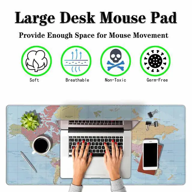 The mouse pad for desk size is 900 x 400 x 3mm ( 35.4 x 15.7 x 0.11 inch). About the package is includ one piece mouse pad, which lagre big extended size mousepadthe material is Chamfered fabric and Rubber Base. The soft and dense non-skid nature rubber base keeps the mat firmly in place, it can effectively prevent the mouse and keyboardfrom sliding and moving. suit to all types of desks including wood, glass, leather, metal, marble desk and so on. desk pad is flexibleenough to be rolled up carry, if you want to use when travel.