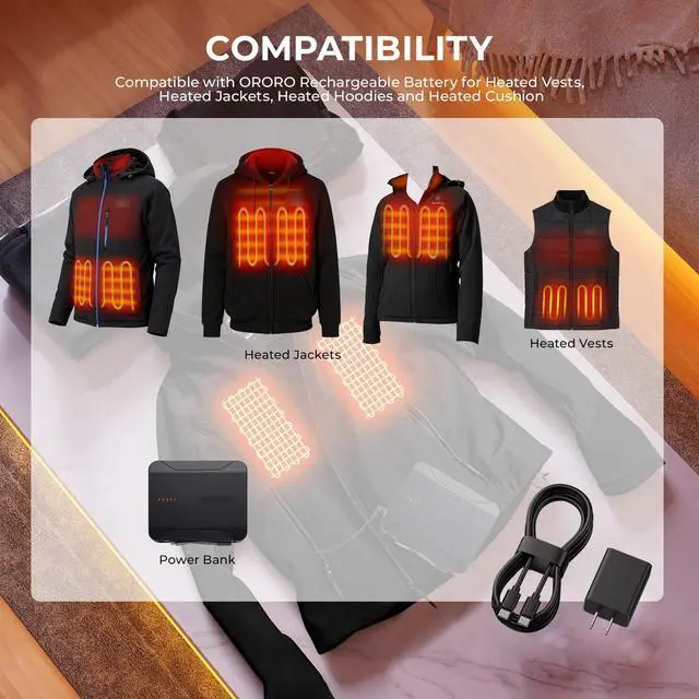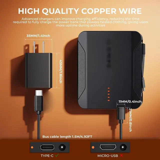 [Precise Compatibility] Dual Charging Ports (Type-C and USB-A) compatible with ORORO Heated Apparel 30W Power Bank or Charging your Own Devices