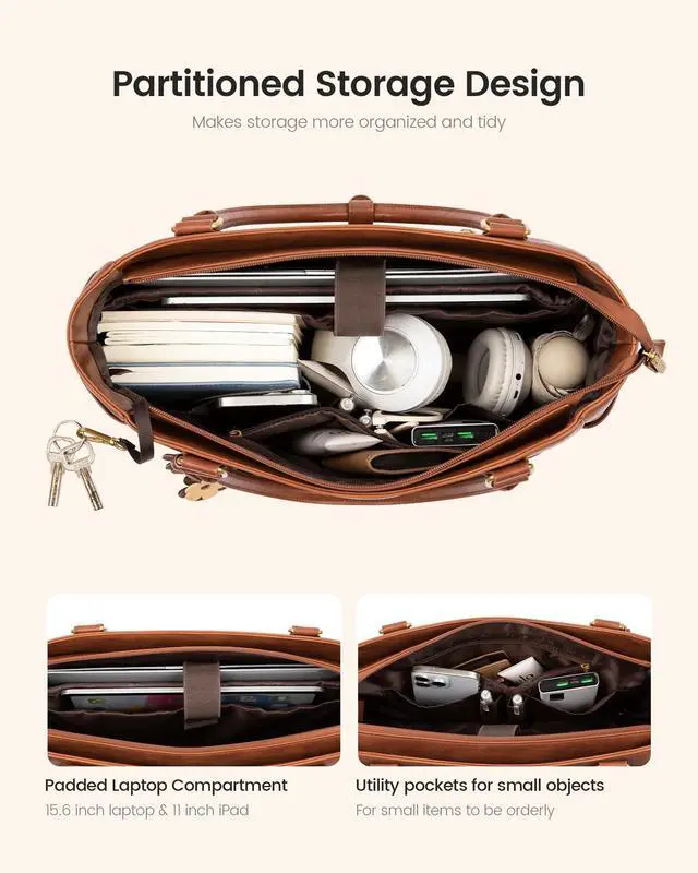 LOVEVOOK Original DesignDesign Inspiration: A Romantic Encounter of Waves and Blooming Flowers; Inspired by the gentle touch of waves caressing the beach and the quiet opening of spring's first flowers, we've captured the flowing curves of waves within the bag, eschewing the rigid lines of traditional bags to create a sense of movement and softness, like the waves, every time you carry it. ^^ Thickened Compartment to Protect Your ComputerThe large-capacity laptop bag is equipped with an independent thickened computer compartment to protect your computer from damage. ^^ Front Compartment DesignThe leather laptop bag has front magnetic pockets for fetching quickily, one padded laptop&ipad compartment, 2 side pocket for large water bottle, inner small pockets and 1 back anti-theft zipper. Make sure your items are organized. ^^ One Bag Fits all OccasionThe elegant and unique design makes the tote bag very suitable for work, office, meeting, business trip, travel, coffee shop and other places as women's briefcase, teacher's handbag purse, computer tote bag or women's messenger bag. Simple color matching are easy to match with various clothing styles. ^^ Perfect Size Tote Bag Measuring 16.5" L x 5.2" W x 12" H, this shoulder bag for women is an ideal gift for your wife, girlfriend, mom, daughter, family members, and friends.