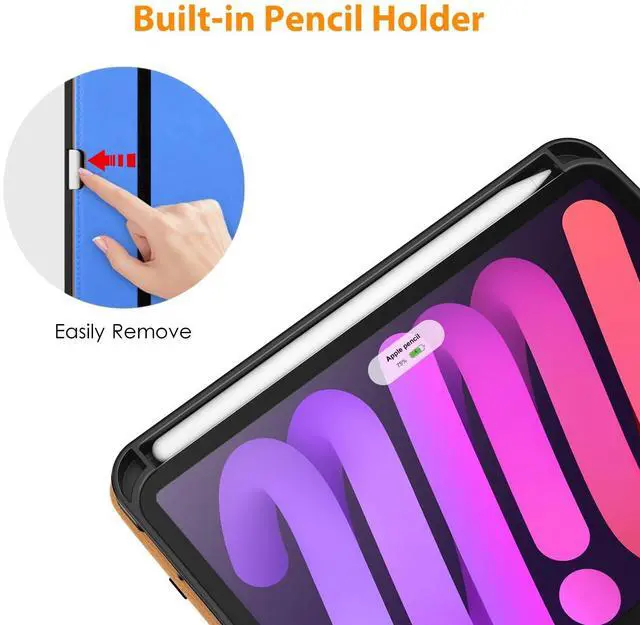 Please Note: Pencil is not included. Cutouts allow easy access to the charging ports, speakers and microphones ^^ Magnetic Smart Cover - Support Auto Wake/Sleep, built-in leather hand strap(one-handed operation) and external elastic band enhances magnetic closure ^^ Multi Function - Multiple horizontal bracket angles for comfortable watching movie or typing. Features front document card pocket to keep notes, cash, cards ^^ Premium Material - Exterior is made of premium synthetic leather, lined with microfiber provide full protection for your iPad Mini 6, against impacts, drops and scratches