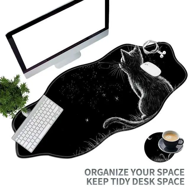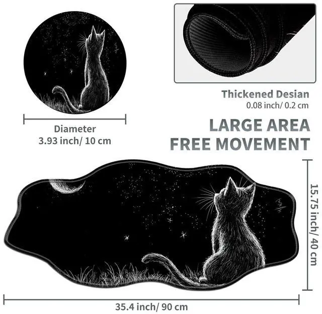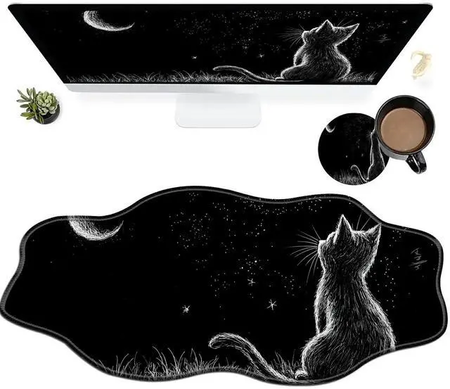 Black Cat Moon Large Gaming Mouse Pad Plus a Coaster, 35.4 x 15.7 inches Desk Mat Extended XXL Mousepad with Stitched Edge Non-Slip Rubber, Desk Pad Computer Mouse Mat for Home Office