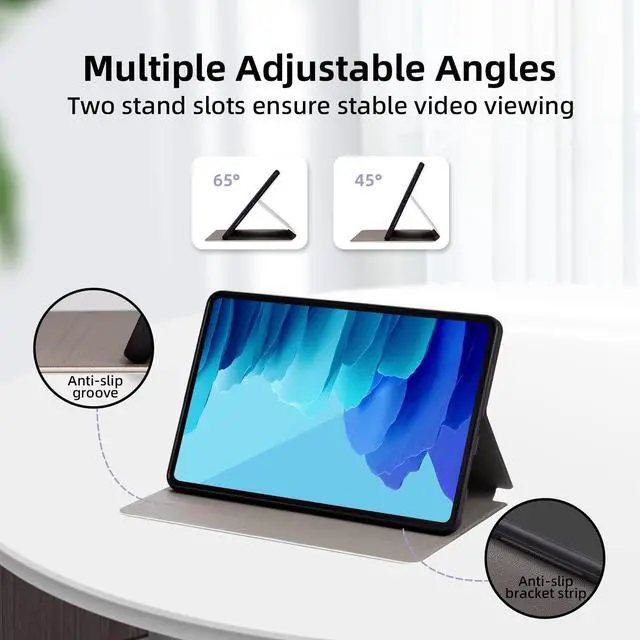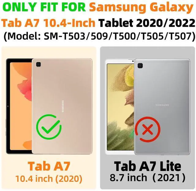 for Samsung Galaxy Tab A7 10.4 CaseOnly designed for Samsung Galaxy Tab A7 10.4 inch tablet (Model: SM-T503/509) 2022 & (SM-T500/T505/T507) 2020 Released. NOT compatible with any other model devices. Please kindly check the model number SM-T *** on the tablet Setting before purchase! More power saving and durable, Support auto sleep/wake feature. Two Stand Slots Ensure Steady and SturdyThe twofold stand case cover provides a convenient stand position for reading, watching videos/movies, gaming, learning, or typing with your Galaxy Tab A7 tablet. Shockproof ProtectionThe outer PU leather shell protects your Galaxy tablet A7 10.4 tablet from shocks, drops, and impacts.